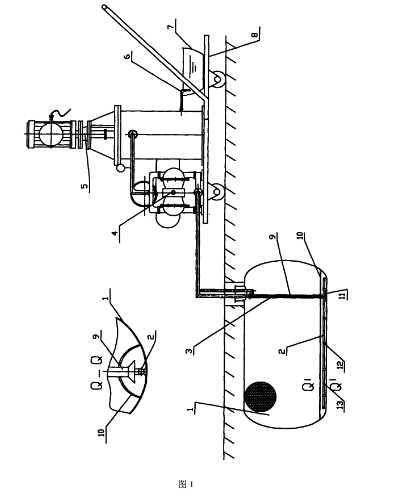 預(yù)先得知防爆儲罐內(nèi)的存儲油(介質(zhì))使用底線(即加油機(jī)抽不到油為止,如25M3的防爆儲汽油罐,剩余油量約為0.8M3)。此時打開防爆儲罐1人孔蓋,將豎井內(nèi)的防爆材料和豎井下部的清污隧道10移出罐外;將吸油管9(最好使用單個吸油管)插入到清污隧道10內(nèi),啟動氣動隔膜泵4將清污隧道10內(nèi)剩余油污輸送給自動清洗過濾器5進(jìn)行過濾,過濾后的清潔油不送回防爆儲罐,另外儲存到容器內(nèi),直到將清污隧道內(nèi)的油污抽完為止。然后將設(shè)計多段的噴射橫管2放入到清污隧道10內(nèi)。由于豎井的尺寸有限,噴射橫管2中間設(shè)計為能通過豎井放入到清污隧道10內(nèi)為好,其余兩段或多段的噴射橫管與中間段噴射橫管用對接管頭對接一體,并用卡箍固定好清污隧道10內(nèi),再將噴射豎管2和吸油管9與其連接(如使用同心的噴射豎管3和吸油管9是應(yīng)將單個吸油管取出),并將與豎井固定好,同心的噴射豎管3和吸油管9快速接頭14應(yīng)由盲板保護(hù)。這里說明的是同心設(shè)置的噴射管和吸油管只是安裝到位,為下一次清污作業(yè)使用的。