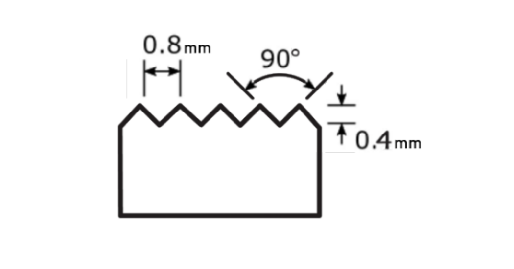 處理 螺旋鋸齒表面處理也是一個連續(xù)凹槽,類似于標準庫存表面處理,因為凹槽是使用 90° 夾角“V”工具生成的。對于所有尺寸,槽深 1/64”,進給深度為 1/32”。