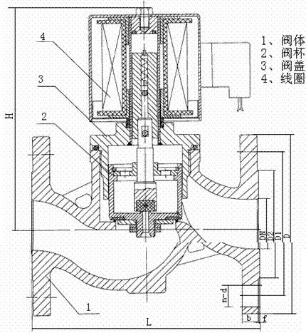 本閥為分步動作直接導式常閉電磁閥,線圈通電后銜鐵先帶動小閥開啟,大閥在所形成的介質(zhì)壓差和電磁力的作用下而開啟。線圈斷電,銜鐵部件復位,大小閥利用介質(zhì)壓力而緊密關(guān)閉。