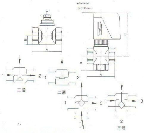 三、VA7010系列風機盤管電動閥結(jié)構(gòu)、尺寸及安裝示意圖: